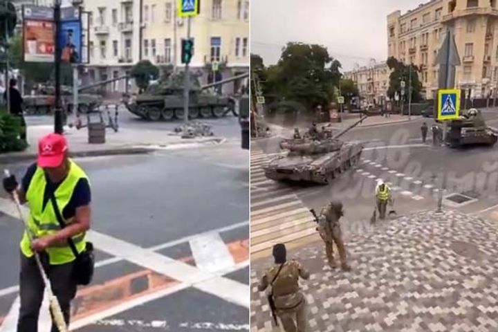 As the clashes between the Russian army and the Wagner Group raged, sanitation workers showed up to work to clean the streets on Saturday morning. The videos of sweepers doing their work despite the war-like situation in Rostov have surfaced online. In one of the videos, a sweeper can be seen cleaning a road, and he is surrounded by army personnel and battle tanks.