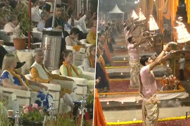 G20 delegates attend Ganga Aarti at Dashashwamedh Ghat along with EAM S Jaishankar