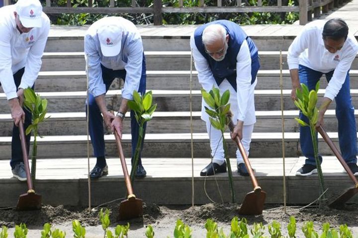 PM Modi, along with other world leaders, visited and planted mangroves in Bali's largest mangrove forest Taman Hutan Raya Ngurah Rai on the sidelines of the G-20 Summit here on Wednesday. Modi is in Bali to attend the G20 summit which opened here on Tuesday. Modi was welcomed at the summit venue by Indonesian President Joko Widodo, ahead of the formal opening of the summit.