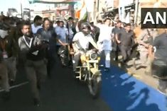 Congress leader Rahul Gandhi rides bike during Bharat Jodo Yatra in Madhya Pradesh