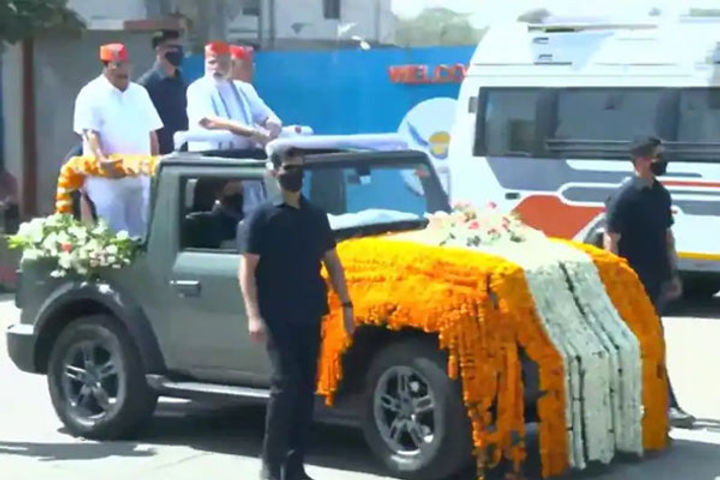 PM Narendra Modi rides India-made Mahindra Thar SUV during Ahmedabad roadshow