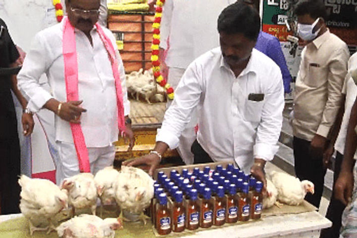 TRS leader brazenly distributes liquor bottles & live chicken to celebrate CM KCR's launch of national party
