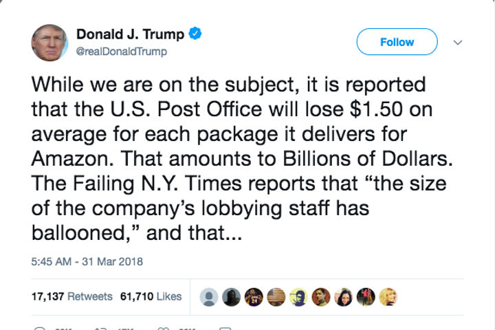 Donald Trump attacked Amazon.com for the second time via tweets on Twitter. The President of United States said that the online retailer needs to pay the actual costs and taxes now. Trump claimed that the U.S. Postal Service will lose $1.05 on average for each package delivered to Amazon. Amazon lost $53 billion in the market after Axios reported that Donald Trump likes to regulate the e-commerce giant.