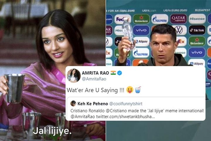 The video of Ronaldo's action of keeping Coca-Cola bottles aside went viral on social media with fans transforming Ronaldo’s visuals into hilarious memes.One of the memes going viral in India is the ‘Jal lijiye’ meme inspired by a scene from the Bollywood movie ‘Vivah’ starring Shahid Kapoor and Amrita Rao. The actress has reacted to the viral meme featuring her and Ronaldo and came up with a pun. “Wat’er Are U Saying,” she wrote.