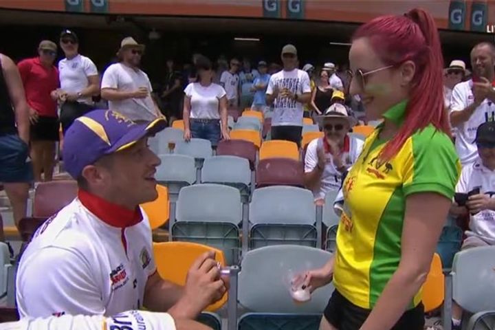 The Ashes cricket series is known for fierce rivalry between Australia and England. However, on Friday, a rare occurence took place when an England fan, member of the famous Barmy Army, proposed an Australian girl in the stands. Rob Hale, member of the Brisbane Barmies, proposed to his girlfriend Natalie during Day 3 of the first Ashes Test at the Gabba. Natalie was surprised by this proposal and instanyly said yes to the marriage.