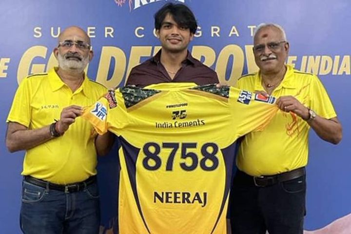Chennai Super Kings has rewarded Olympic Gold medalist Neeraj Chopra with Rs 1 crore for his stellar achievement - winning gold in the javelin throw at the 2020 Tokyo Olympics - in New Delhi on Sunday. Chennai Super Kings also presented a special jersey with the number 8758 as a mark of respect to Neeraj, who joined Abhinav Bindra as only the second individual gold medalist in the Olympics.