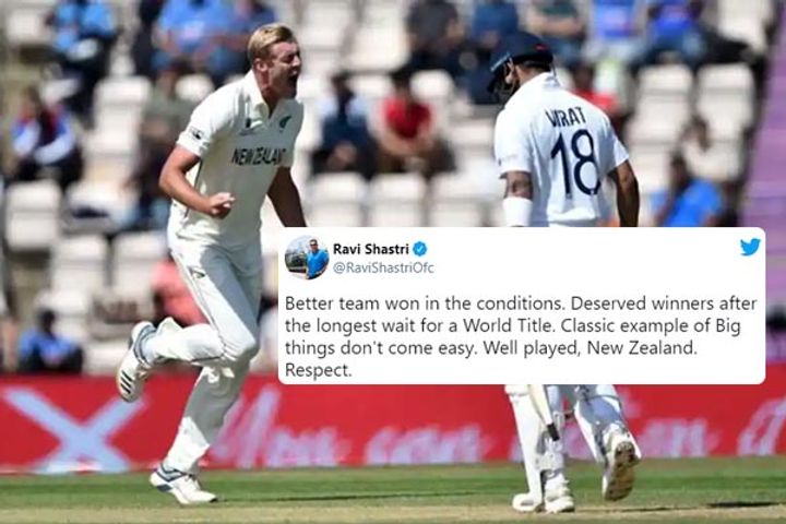 A day after losing the World Test Championship final against New Zealand, Team India head coach Ravi Shastri on Thursday congratulated the Kiwis. Reacting to the result, Shastri in a tweet wrote: "Better team won in the conditions. Deserved winners after the longest wait for a World Title. Classic example of Big things don't come easy. Well played, New Zealand. Respect."