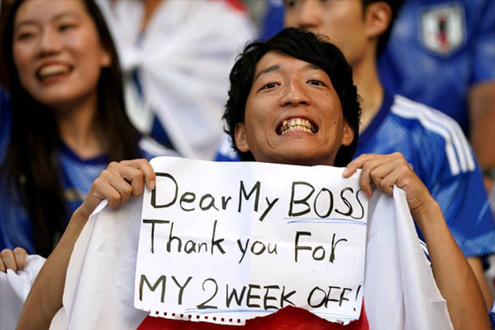 A football fan from Japan grabbed the attention on camera for expressing gratitude towards his boss on the account of granting him a two-week period leave to vibe in the FIFA fever. "Dear My BOSS, Thank you for MY 2 WEEK OFF (sic)," a man holding these words on a placard gained spotlight during the Germany vs Japan match on Wednesday.