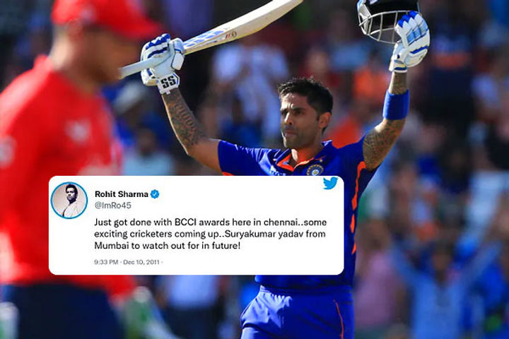 With Suryakumar Yadav scoring his maiden T20I ton, India skipper Rohit Sharma’s social media post from ten years ago has come to light. “Just got done with BCCI awards here in Chennai..some exciting cricketers coming up..Suryakumar yadav from Mumbai to watch out for in future!” Rohit wrote on Twitter on December 10, 2011.