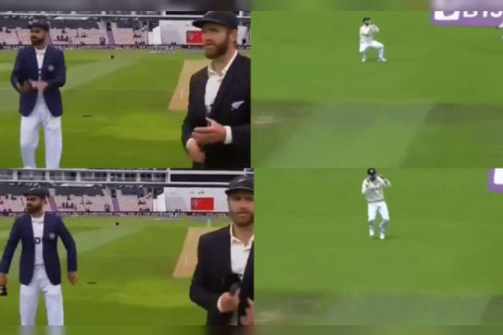 Off the 177th ball that he faced, Williamson, wafted at a wide delivery only to be caught by his counterpart Virat Kohli in the slips. Twitter has found another angle to the dismissal as a fan has captured a pre-match video of the two captains in which Williamson threw the mic towards Kohli and the latter held the catch nicely. It was after the toss happened when the duo had to front up the camera.