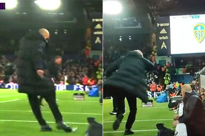 Manchester City boss Pep Guardiola panics after kicking bottle at Leeds bench