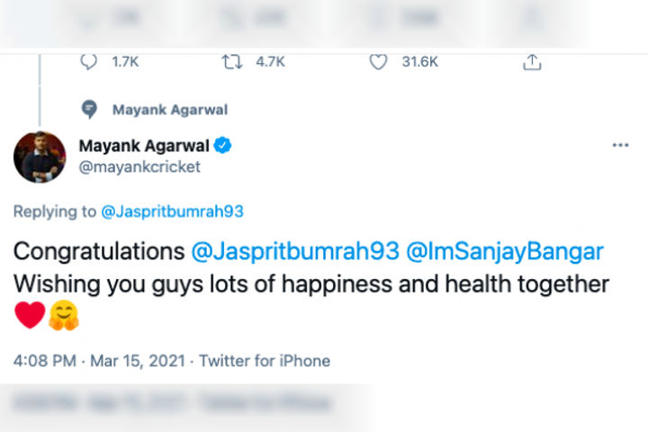 Mayank Agarwal mistakes Sanjay Bangar for Sanjana Ganeshan while wishing Jasprit Bumrah on wedding