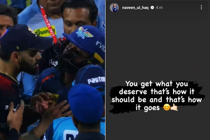 RCB clinched an 18-run victory over LSG in their latest IPL 2023 match. Following the game, LSG pacer Naveen-ul-Haq got involved in a heated altercation with RCB batter Virat Kohli. Taking to Instagram, Naveen has posted a cryptic story. "You get what you deserve and that's how it should be and that's it goes," reads the caption of Naveen's Instagram story.