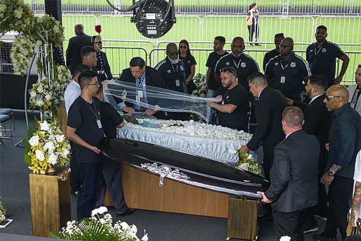 Thousands of mourners, including high school students and supreme court justices, began filing past the body of Pelé on the century-old field where he made his hometown team one of Brazil's best. The football great died on Thursday after a battle with cancer. He was the only player ever to win three World Cups, and he was 82.