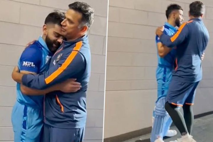 Rahul Dravid hugs Virat Kohli after batter takes India over the line against Pakistan