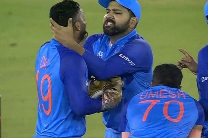 India and Australia were involved in a high-scoring encounter in the first T20I. India stormed back into the contest in the second half of the innings picking up quick wickets. However, more than the wickets, the video of Rohit Sharma funnily grabbing Karthik's neck after taking a review over Maxwell's dismissal caught the attention of many. Rohit seemed agitated with Karthik and then funnily grabbed his neck with both his hands.