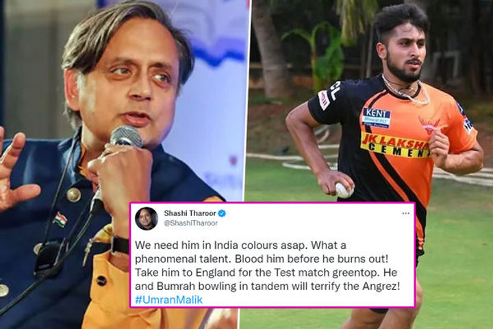 Indian politician Shashi Tharoor had words of praise for pace sensational Umran Malik and called for him to be included to India's Test squad for the fifth Test against England in June. Taking to social media, Tharoor, while replying to a tweet, wrote, "Take him to England for the Test match greentop. He and Bumrah bowling in tandem will terrify the Angrez!"
