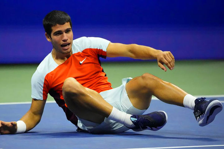 In the U.S. Open final on Sunday, Spanish teenager Carlos Alcaraz defeated Norway's Casper Ruud 6-4 2-6 7-6(1) 6-3 to win his first Grand Slam championship and get to the top of the world for the first time. Alcaraz, 19, after winning went down to the ground on his back, cupped his hands to his face, and then rolled over. He then jumped up and embraced Ruud at the net.