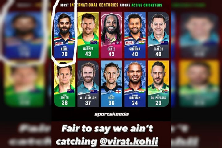 Australian opener David Warner has candidly admitted that no active cricketer can come anywhere close to Indian captain Virat Kohli’s 70 international hundreds. On Saturday, Sportskeeda shared a post on their official Instagram account, which featured active cricketers who have scored the most international hundreds. Reacting to SK’s post, Warner admitted through an Instagram story: “Fair to say we ain’t catching @virat.kohli.”
