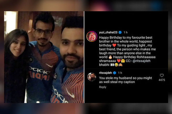 Rohit Sharma is well known for his easy going and friendly personality among his teammates. On the special occasion of Rohit's 36th birthday, Yuzvendra Chahal and Ritika engage in a funny banter on Instagram. Chahal shared a heartfelt wish for the Indian team captain, mischievously tagging Ritika in the caption courtesy. To which Ritika replied, "You stole my husband so you might as well steal my caption."