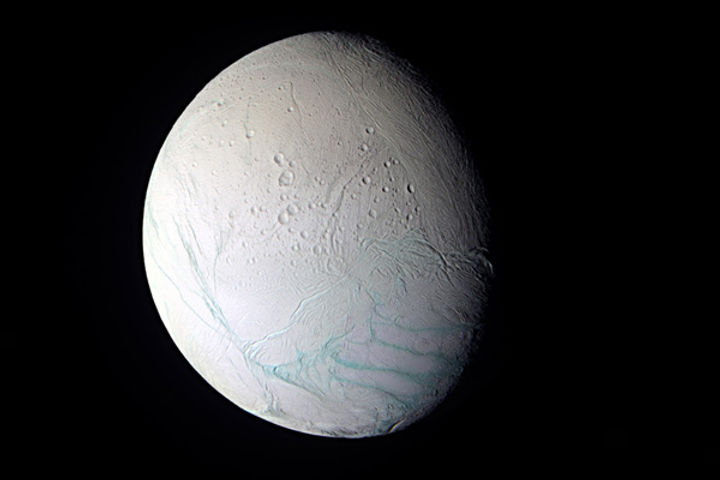 NASA has shared a stunning picture of Enceladus, the sixth-largest moon of Saturn known to harbor oceans beneath its frozen crust. In the color-enhanced image, snapped by the Cassini spacecraft, pale blue fractures—possibly rivers—cut through the surface of the moon and deep craters have also been spotted. The planet is not completely visible since it's obscured by the moon's shadow.