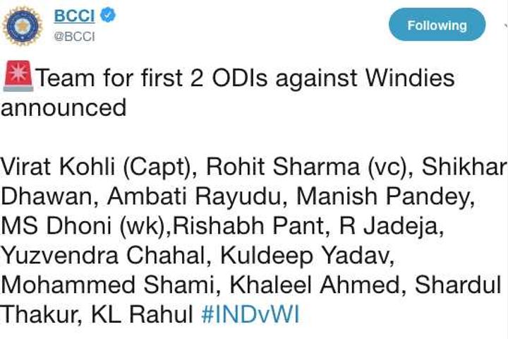 BCCI announces squad for 1st two ODIs vs WI, Rishabh Pant gets maiden ODI call-up