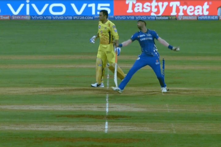During the MI and CSK match yesterday, spinner Krunal Pandya stopped short of delivering to CSK’s Kedar Jadhav despite going though his full action. Dhoni was at the non-striker’s end, and he was trying to get a start, but his bat stayed firmly inside the crease. Pandya didn’t have any conversation with Dhoni, but from the replays, it seems like Pandya was mindful of the fact that Dhoni was looking to move out of the crease.