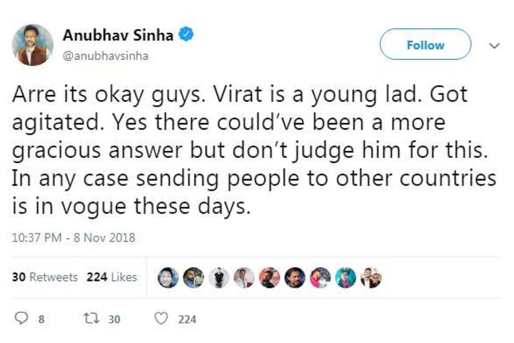 Indian cricketer Virat Kohli is in controversies these days after he called a fan to leave India who said that he loves English and Australian cricketers more. Since then the cricketer has been facing criticism from cricket lovers, while many defended him as well. Filmmaker Anubhav Sinha on Friday supported Virat and said that he is a young fellow. Yes, there could've been a more polite answer but don't judge him for this.