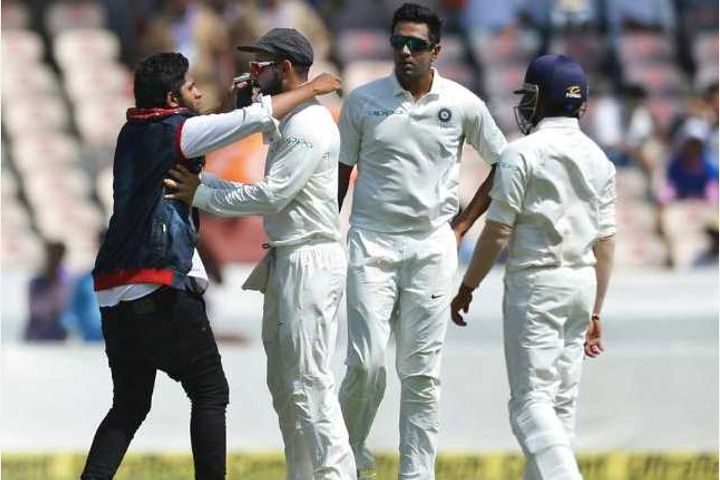 Seems like breaking security cordon to reach Virat Kohli has become a new trend as in yet another incident a fan reached up to Virat Kohli during the first day of the second Test at the Rajiv Gandhi International stadium. A fan gave a tight hug and then took a selfie with the skipper. This is the second time that a fan has interrupted play to click a selfie with Kohli after a similar incident in Rajkot in last test match.