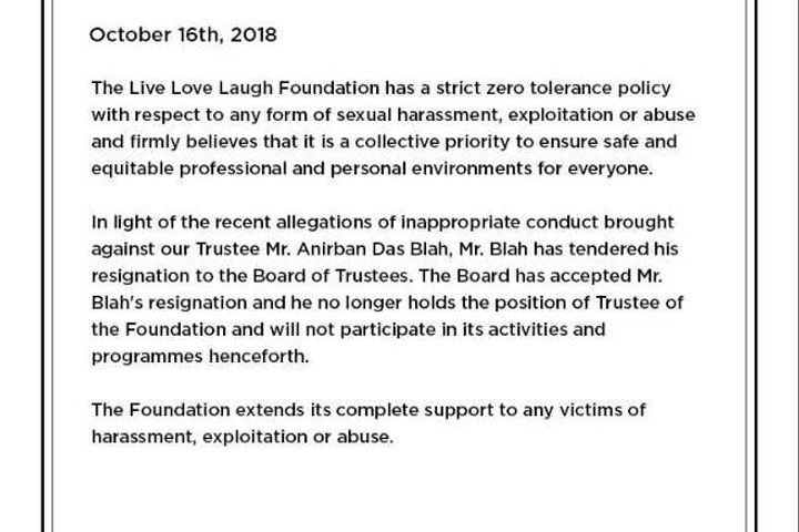 As the #MeToo movement is revealing many cases of sexual harassment one more has come in the series. Anirban Das Blah was accused of sexual harassment following which Deepika Padukone’s The Live Love Laugh Foundation has terminated him. The foundation has issued an official statement through its official Twitter account stating that they don’t at all tolerate such kind of misbehavior towards women.
