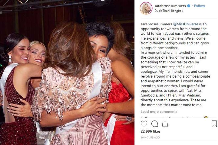 Miss USA Sarah Rose Summers has apologized to her fellow contestants, Miss Cambodia Rern Sinat and Miss Vietnam H’Hen Nie for insulting them, in a video that went viral, for not being able to speak English. After the video went viral she was criticized a lot by netizens for being racist, which led to an apology. In a post on Instagram, she wrote: "I now realize what I said was not respectful and I apologize for that."