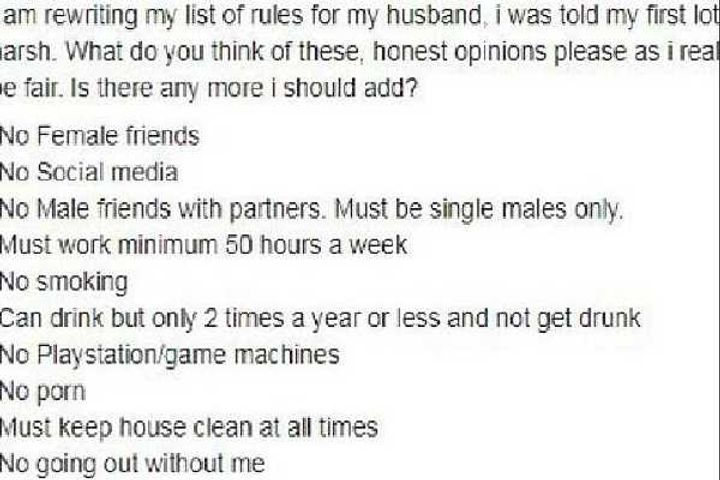 Searching for something unique to read? Here it is. An Australian woman writes 10 strict rules for her husband, which is now going viral. The rules include no talking with females, no use of social media, only single male friends, must work 50 hours a week and few more. After sharing them on the Facebook group she asked for feedback, but just getting trolled. Users are wishing luck to her husband.