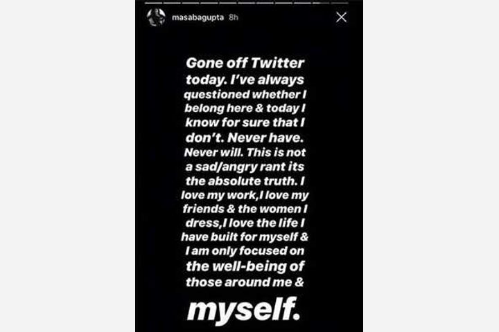 No one likes negativity and so after actress Sonam Kapoor, Designer Masaba Gupta quits Twitter. Sonam took a break from Twitter due to increasing negativity and for almost the same reason Masaba too left Twitter. In her Instagram status, she said that she is saying bye to Twitter and has always thought if she belongs here and finally she realized that she doesn’t. She said that she just want positivity around her.