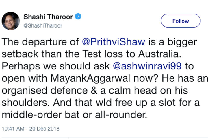 Shashi Tharoor wants R Ashwin and Mayank Agarwal to open in Boxing Day Test