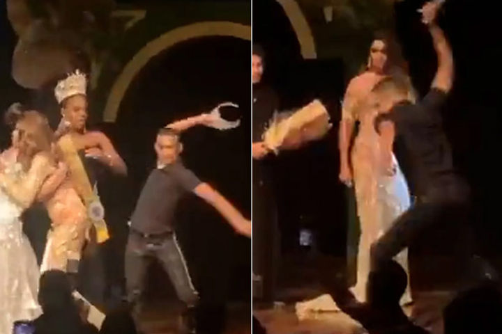 ब्राजील के ब्यूटी कॉन्टेस्ट का एक वीडियो हालिया वायरल हो रहा है। जिसमें LGBTQIAP+ कम्यूनिटी के ब्यूटी पेजेंट का आयोजन किया गया था। इस ब्यूटी कॉन्टेस्ट में नथाली बेकर नाम की कॉन्टेस्टेंट के सेकंड आने पर उसका पति गुस्से में मंच पर गया और क्राउन छीनकर उसे जमीन पर पटककर तोड़ दिया। उस वक्त वह क्राउन विजेता इमानुऐली बेलिनी को पहनाया जाना था। जिसके बाद गार्ड्स ने आरोपी को दबोचा।