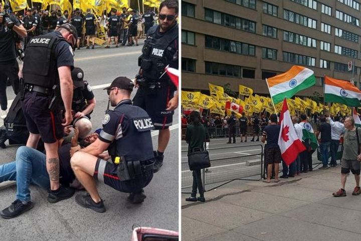 कनाडा में सिख फॉर जस्टिस (SFJ) ने भारतीय दूतावास के बाहर प्रदर्शन की घोषणा की थी। इसी कड़ी में शनिवार को टोरंटो में भारतीय वाणिज्य दूतावास के बाहर करीब 250 खालिस्तान समर्थकों ने प्रदर्शन किया। भारत समेत कई देशों में प्रतिबंधित आतंकी संगठन SFJ ने कनाडा के वैंकुवर में खालिस्तान समर्थक नेता हरदीप सिंह निज्जर की मौत के बाद इस प्रदर्शन का ऐलान किया था। इस दौरान खालिस्तान प्रदर्शनकारियों के सामने भारतीय समुदाय के लोग तिरंगा लहराते हुए खड़े रहे।