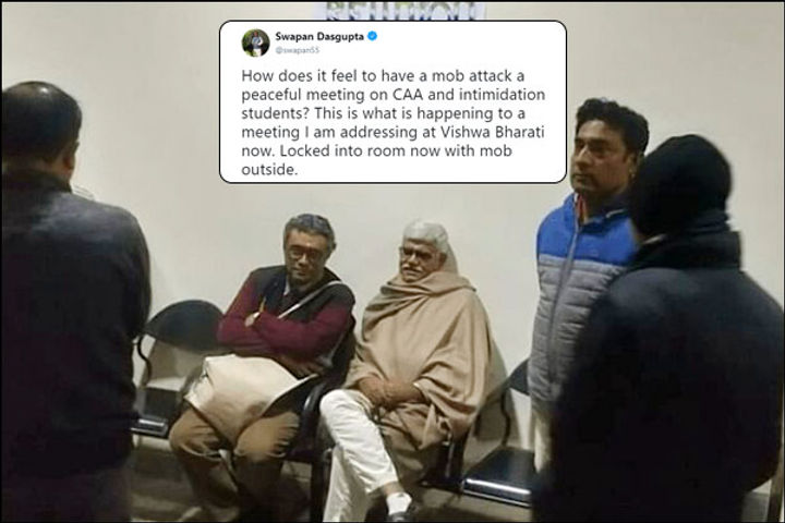 बंगाल में विश्वभारती यूनिवर्सिटी में CAA पर लेक्चर देने गए बीजेपी सांसद स्वप्न दासगुप्ता का माकपा की छात्र इकाई एसएफआई ने विरोध किया। वामपंथियों ने उनका कार्यक्रम बंद कराया। आलम ये रहा कि सुरक्षा की दृष्टि में स्वप्न दासगुप्ता को एक कमरे में बंद करना पड़ा। घेराव की बात कहकर दासगुप्ता ने ट्वीट किया- शांतिपूर्ण बैठक में भीड़ का हमला कैसा लगता है? मुझे कमरे में बंद किया गया था।