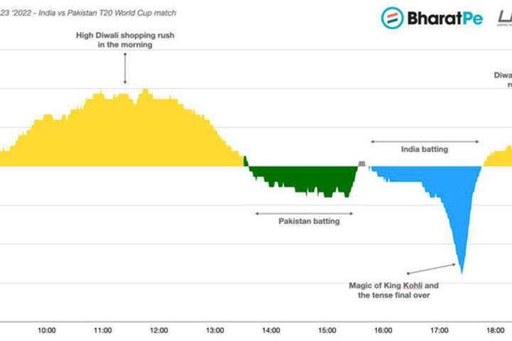 दिवाली से एक दिन पहले टी20 वर्ल्ड कप में पाकिस्तान के खिलाफ कोहली की पारी का असर दिवाली की शॉपिंग पर भी नजर आया.इंवेस्टमेंट अफसर की ओर से साझा किए गए ग्राफ से खुलासा हुआ है कि रविवार को पाकिस्तान के खिलाफ मैच के दौरान कोहली की बल्लेबाजी के समय यूपीआई ट्रांजैक्शन में तेज गिरावट हुई. कुछ देर के लिए ऑनलाइन शॉपिंग लगभग रूक गया था. पूरा देश टीवी या मोबाइल पर टकटकी लगाए मैच देख रहा था.