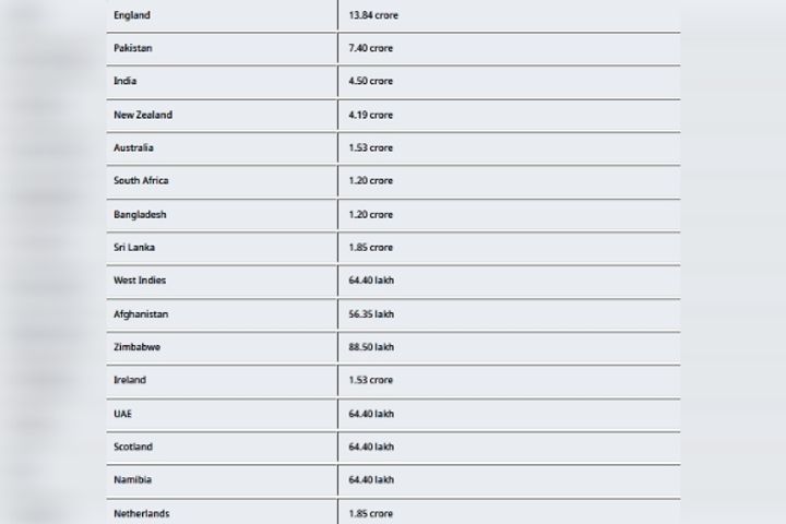 आईसीसी टी-20 विश्व कप 2022 विजेता इंग्लैंड को 13.84 करोड़ रुपये; उप-विजेता पाकिस्तान को 7.40 करोड़; भारत और न्यूज़ीलैंड को क्रमश: 4.50 करोड़ रुपये और 4.19 करोड़ रुपये मिले। ऑस्ट्रेलिया और आयरलैंड को 1.53 करोड़ (प्रत्येक); साउथ अफ्रीका और बांग्लादेश को 1.20 करोड़ रुपये (प्रत्येक); नीदरलैंड्स और श्रीलंका को 1.85 करोड़ (प्रत्येक); वेस्टइंडीज, यूएई, नामीबिया और स्कॉटलैंड को 64.40 लाख रुपये (प्रत्येक); अफगानिस्तान को करोड़ 56.35 करोड़ रुपये जबकि जिम्बाव्बे को 88.50 करोड़ रुपये मिले।