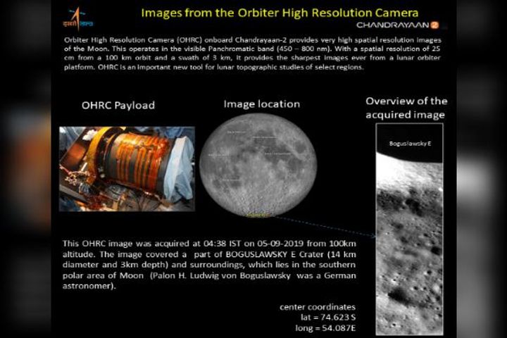 इसरो ने चंद्रयान-2 के ऑर्बिटर हाई रेजोल्यूशन कैमरे से ली गई तस्वीर को जारी किया है। इस हाई रेजोल्यूशन कैमरे ने चंद्रमा के सतह की तस्वीर ली है। इस तस्वीर में चंद्रमा के सतह पर छोटे और बड़े गड्ढे दिख रहे हैं। बता दें कि ऑर्बिटर हाई रेजोल्यूशन कैमरे चंद्रमा की सतह पर चंद्रयान-2 की हाई रेजोल्यूशन तस्वीरें मुहैया कराता है। ये पैंक्रोमैटिक बैंड (450-800 nm) पर संचालित होता है
